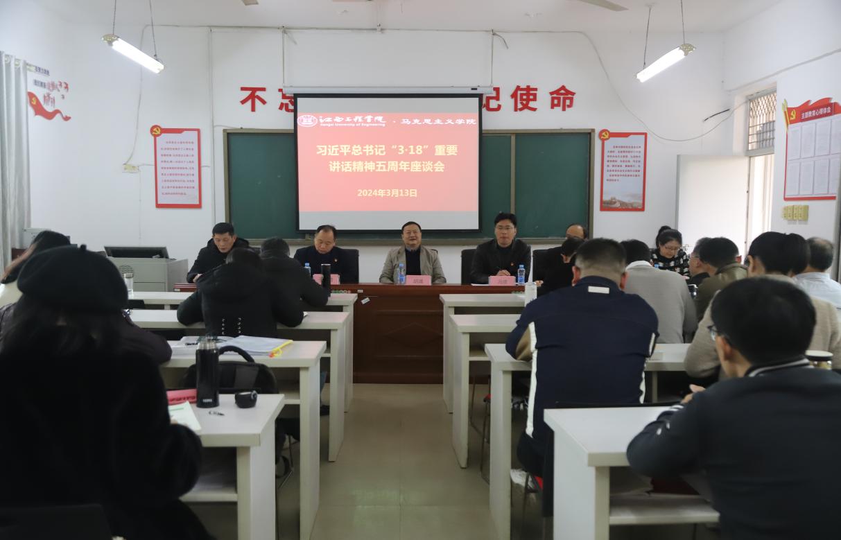 今年是习近平总书记“3·18”重要讲话发表五周年,为深入贯彻落实习近平总书记“3·18”重要讲话精神,进一步提升学校思政课水平,更好实现思政课“立德树人、铸魂育人”根本任务,3月13日,江西工程学院召开习近平总书记“3.18”重要讲话发表五周年学习座谈会。江西工程学院党委书记、督导专员胡涌出席座谈会并讲话,学校党委副书记、副校长冯赟,党委委员、宣传部部长于永清,党委办公室主任刘勇及马克思主义学院全体教师参加座谈会。