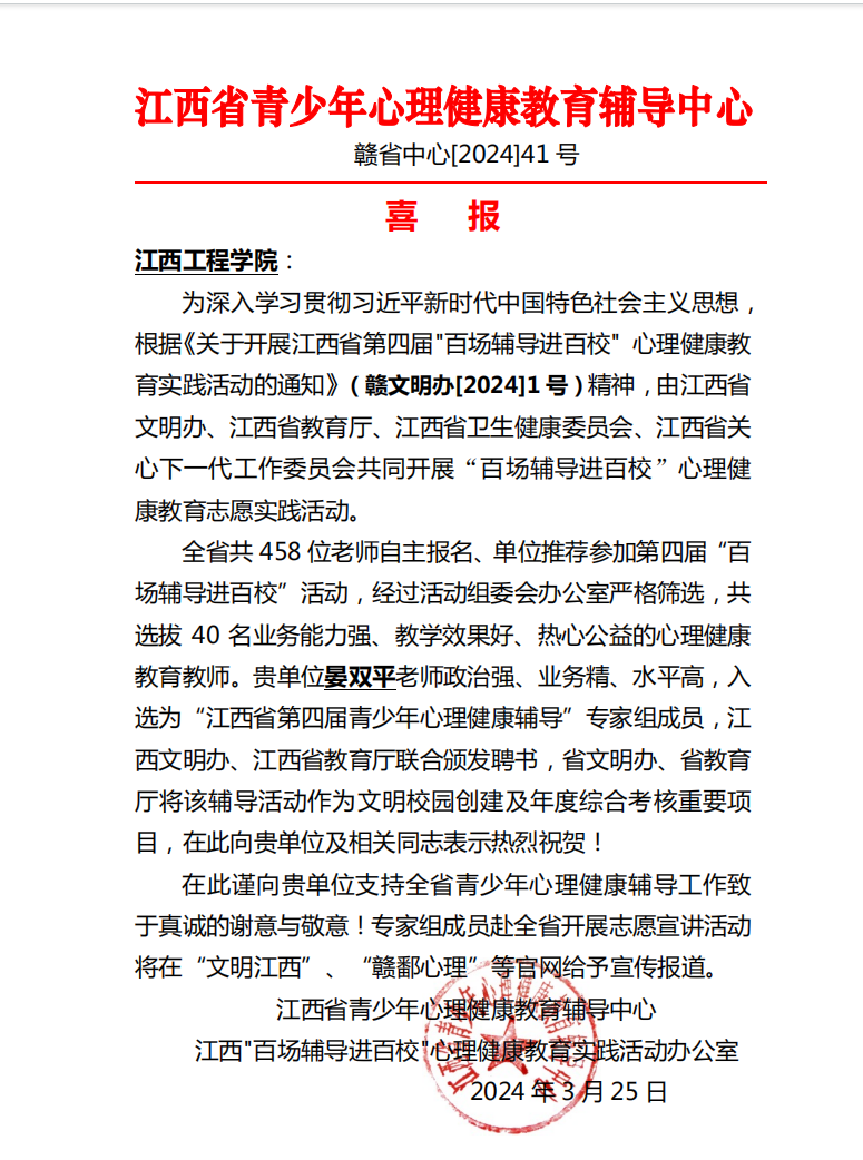 经学校积极组织报名申请,百场辅导进百校活动组委会办公室审核教师资质,我校心理健康教育与咨询中心主任晏双平入选第四届江西省“百场辅导进百校”辅导队成员。