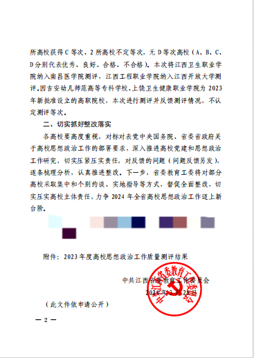 优秀成绩充分体现了学校党委对思想政治工作的高度重视。近年来,我校坚持以习近平新时代中国特色社会主义思想为指导,围绕学习宣传贯彻党的二十大精神这条主线,认真贯彻落实习近平总书记关于教育的重要论述和习近平总书记考察江西重要讲话精神,贯彻落实省委、省委教育工委决策部署,坚持把立德树人作为根本任务,坚持把思想政治工作贯穿教育教学全过程,紧扣建设高水平应用型本科院校,扎实推进课程育人、科研育人、实践育人、文化育人、网络育人、心理育人、管理育人、服务育人、资助育人、组织育人“十大育人”体系建设,着力构建“大思政”格局,坚持把做好宣传思想工作放在我校教育教学和改革发展的大局上来谋划,聚焦重点难点,精准发力、全面部署、科学推进,全面创新性推进思想政治工作,确保了校园安全稳定,为我校高质量发展提供了强大的思想保证和精神动力。