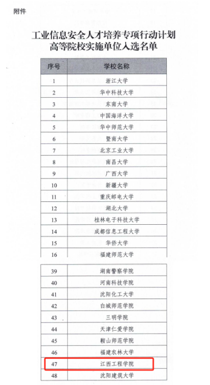 近日,工业和信息化部教育与考试中心发布了《关于公示工业信息安全人才培养专项行动计划高等院校实施单位入选名单的公告》。经过严格的院校申报、组织遴选、分组答辩和专家评审等环节,最终确认了全国48所高等院校为首批专项行动计划实施单位。全省仅南昌大学、江西警察学院、东华理工大学和我校四所本科院校入选,民办本科院校仅我校一所。这不仅是对我校在信息安全领域教育教学工作的充分肯定,也是我校在人才培养方面取得的又一重要成果,更是对我校整体办学实力和人才培养水平的认可。