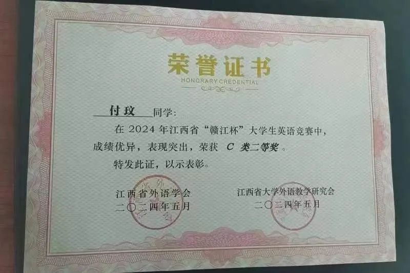2024年5月19日-20日全国大学生英语竞赛江西省决赛暨“赣江杯”大学生英语竞赛在江西农业大学举行。我校2021级计算机科学与技术专升本1班学生付玟在比赛中过关斩将,最终获得江西省决赛暨“赣江杯”大学生英语竞赛二等奖。