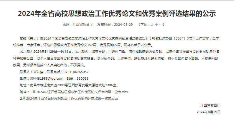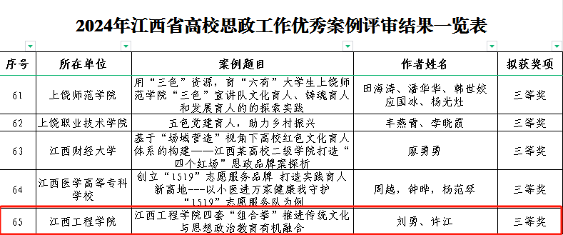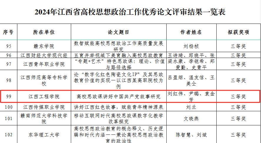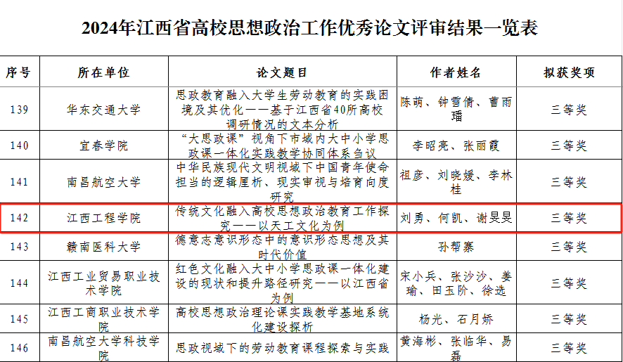 根据《关于开展2024年度全省高校思想政治工作优秀论文和优秀案例征集活动的通知》(赣教社政办函〔2024〕3号)文件精神,经学校推荐、专家评审,省教育厅评选出思想政治工作优秀论文152篇、优秀案例65篇。其中,我校刘红伟、尹璐、袁金芳老师报送的《高校思政课讲好中国共产党故事研究》和刘勇、何凯、谢旻旻老师报送的《传统文化融入高校思想政治教育工作探究——以天工文化为例》拟获2024年江西省高校思想政治工作优秀论文三等奖,刘勇、许江老师报送的《江西工程学院四套“组合拳”推进传统文化与思想政治教育有机融合》拟获2024年江西省高校思政工作优秀案例三等奖。