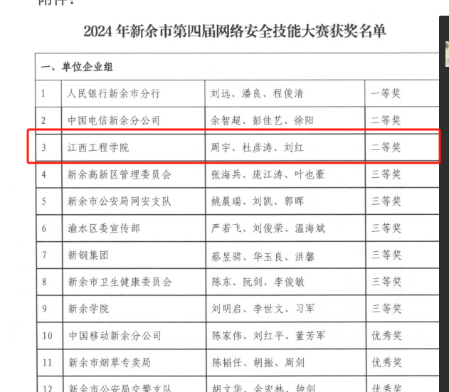 由中共新余市委网络安全和信息化委员会办公室、新余市总工会、新余市人力资源和社会保障局、新余市教育体育局、新余市工业和信息化局、新余市数据局、共青团新余市委员会共同主办的新余市第四届网络安全技能大赛中,我校荣获单位企业组二等奖、学生组二等奖的佳绩。
