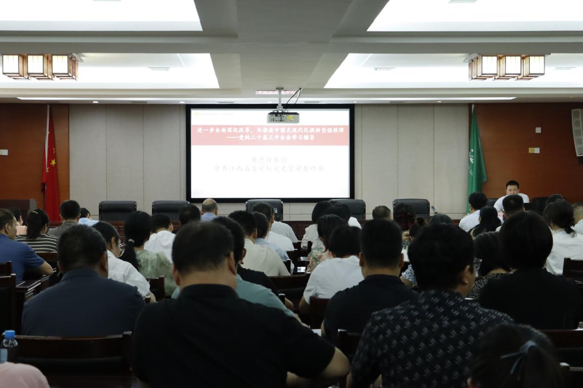 学校邀请到中共江西省委党校党史党建教研部黄德锋教授作专题辅导报告。黄德锋以《进一步全面深化改革,为推进中国式现代化提供坚强保障——党的二十届三中全会学习辅导》为主题,从深刻认识《中共中央关于进一步全面深化改革、推进中国式现代化的决定》要点、准确把握中国式现代化的本质要求及其主要任务、进一步推进全面深化改革的重大部署及其具体举措三方面进行了全面深入解读。