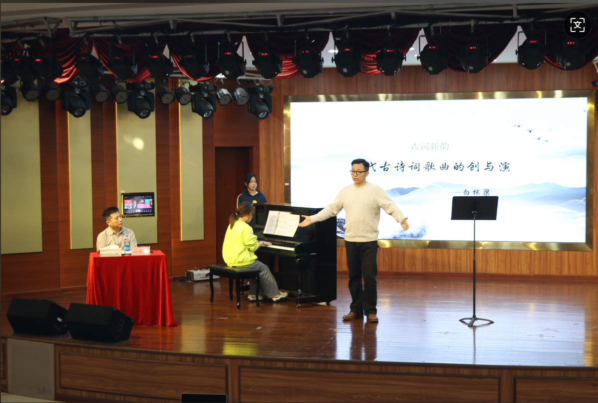 在讲座的公开展示环节,江西工程学院的学生演唱了几首中国古诗词艺术歌曲,其中有两首是由白栋梁副教授参与创编。《关雎》《虞美人・听雨》《更漏子・玉炉香》等古诗词歌曲的魅力在学生们的演唱中得以展现。白栋梁老师在每首作品表演后,对学生们的演唱技巧进行了详细点评与指导,指出学生演唱过程中古诗词曲目的节奏特点、和弦的重要性以及现代和声传递的意境区别。通过白老师的细致指导,师生们深刻感受到歌曲创编内涵与舞台演绎的细腻之处。