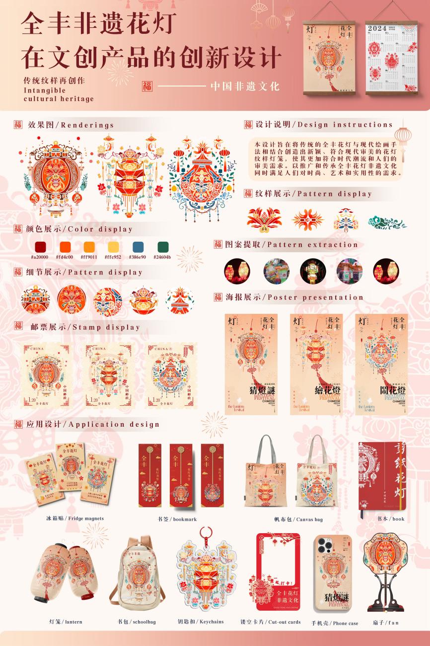 设计说明:《全丰非遗花灯在文创产品的创新设计》致力于融合传统全丰花灯与现代绘画技巧,创造出既新颖又符合现代审美观的花灯纹样灯笼,使其更贴合当代潮流和大众的审美偏好。该设计旨在推广和传承全丰花灯这一非物质文化遗产,同时满足人们对时尚艺术与实用性的双重追求。
