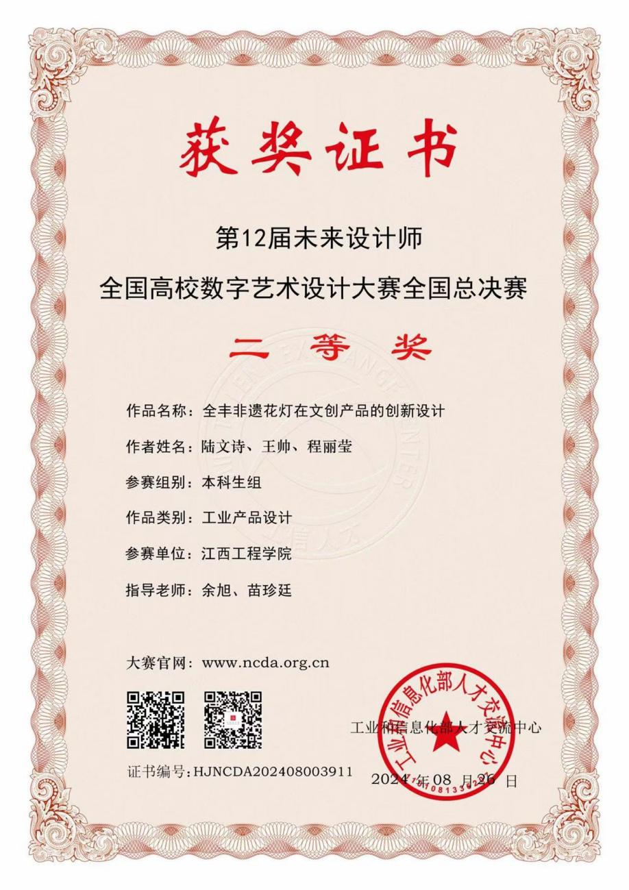 第十二届未来设计师·全国高校数字艺术设计大赛公布全国总决赛结果,以下简称“未来设计师”组委会公布全国赛区比赛结果。抱石艺术学院申报作品《全丰非遗花灯在文创产品的创新设计》(作者:陆文诗,王帅,程丽莹;指导老师:余旭、苗珍廷)荣获全国总决赛二等奖。
