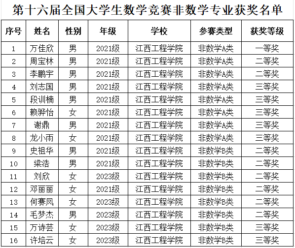 据悉,全国大学生数学竞赛由中国数学会主办,是全国大学生学科竞赛观察目录中的赛事,各省设分赛区,江西赛区共有来自全省50所高校的近八千名学生参加了此次比赛,我校共有34名同学参赛,其中16名同学获奖,获奖率达到47.1%。充分展示了我校学子在数学领域的实力和风采。这一喜人成绩离不开广大师生的共同努力,从动员到备考,再到比赛的成功举办,每一步都倾注了师生们的心血和热情。