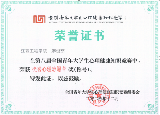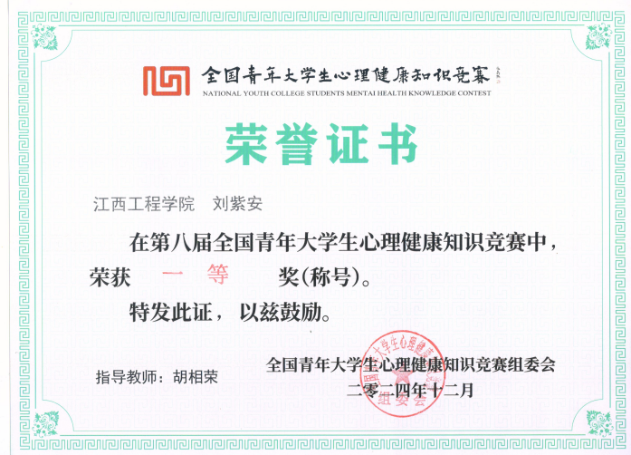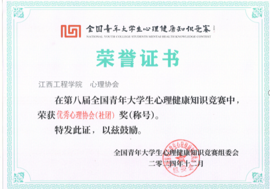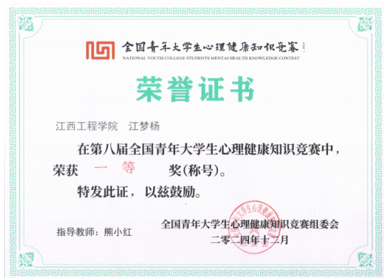 近日,由全国青年大学生心理健康知识竞赛组委会举办的第八届全国青年大学生心理健康知识竞赛于2024年12月6日圆满结束,我校学子在此次竞赛中取得佳绩。