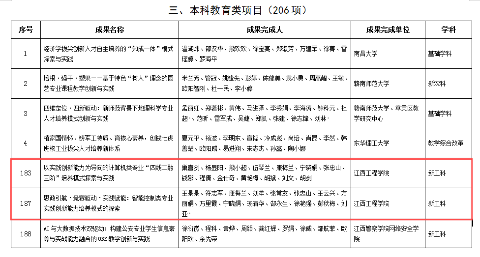 近日,江西省教育厅对2024年江西省教学成果奖青年培育项目拟立项项目进行了公示,我校人工智能与数据科学学院巢喜剑团队申报的《以实践创新能力为导向的计算机类专业“四线二融三阶”培养模式探索与实践》和电子信息工程学院王景景团队申报的《思政引航·竞赛驱动·实践赋能:智能控制类专业实践创新能力培养模式的探索》两个项目最终成功入选,位于全省同类高校前列。升本以来,我校省级教学成果奖项上升至4项。据悉,本次申报项目在自下而上、逐级审核推荐的基础上,经省教育厅组织专家评审、会议研究,拟立项江西省教学成果奖青年培育项目(本科教育类)206项。