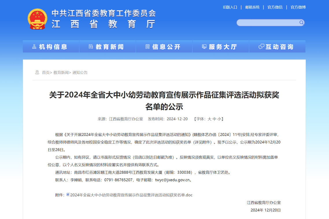 近日,江西省教育厅发布《关于2024年全省大中小幼劳动教育宣传展示作品征集评选活动拟获奖名单的公示》,本次全省大中小幼劳动教育宣传展示作品征集评选活动涵盖劳动清单、劳动教育海报、劳动教育摄影作品三种类型。我校选送的师生作品共荣获本科组二等奖1项、三等奖6项。