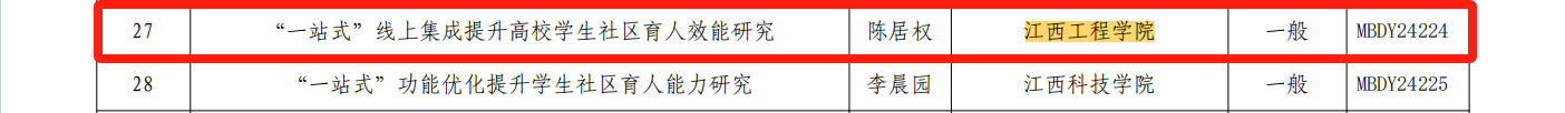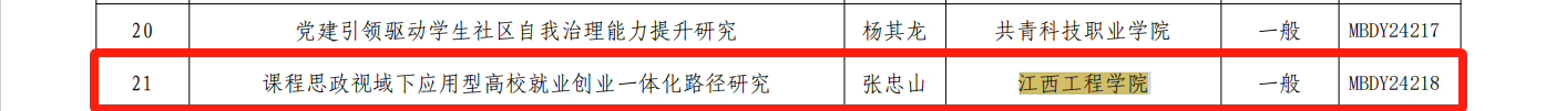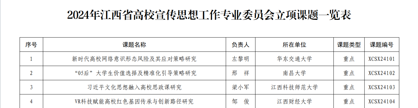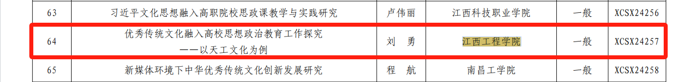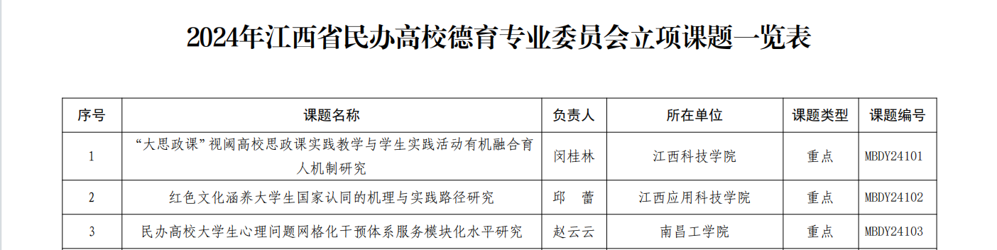 近日,江西省教育厅公布了2024年江西省高等学校思想政治教育研究会课题评审结果,我校教师刘勇申报的《优秀传统文化融入高校思想政治教育工作探究——以天工文化为例》获得江西省高校宣传思想工作专业委员会一般课题立项,陈居权老师申报的《“一站式”线上集成提升高校学生社区育人效能研究》获得江西省民办高校德育专业委员会一般课题立项,张忠山老师申报的《课程思政视域下应用型高校就业创业一体化路径研究》获得江西省民办高校德育专业委员会一般课题立项。