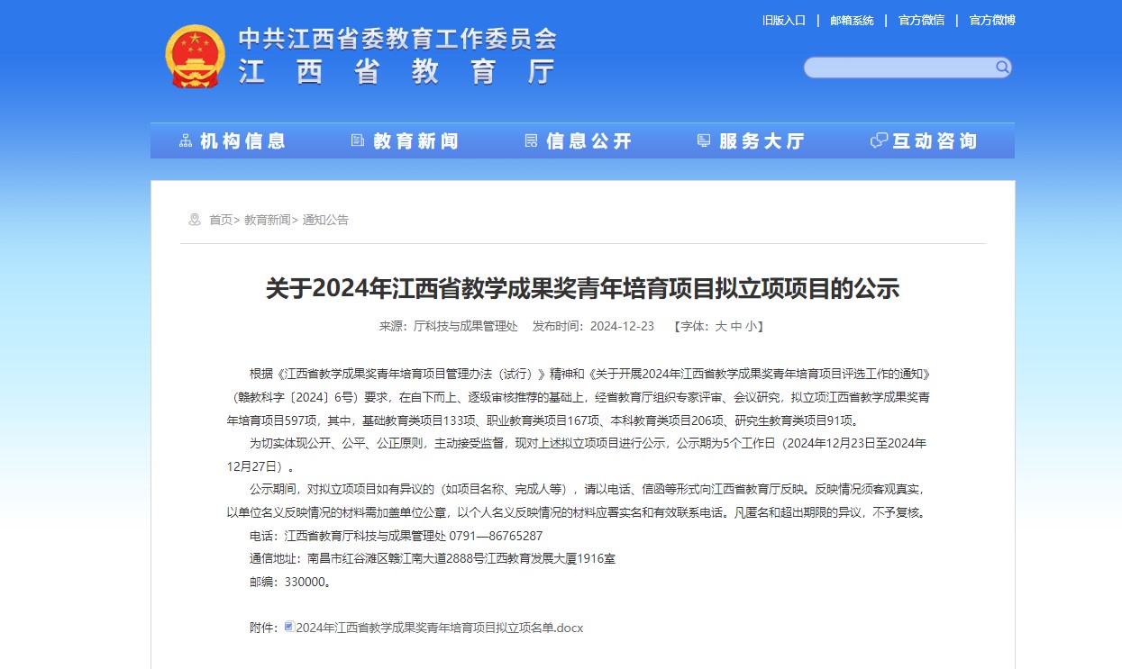 据悉,本次申报项目经省教育厅组织专家评审、会议研究,拟立项江西省教学成果奖青年培育项目(本科教育类)206项。