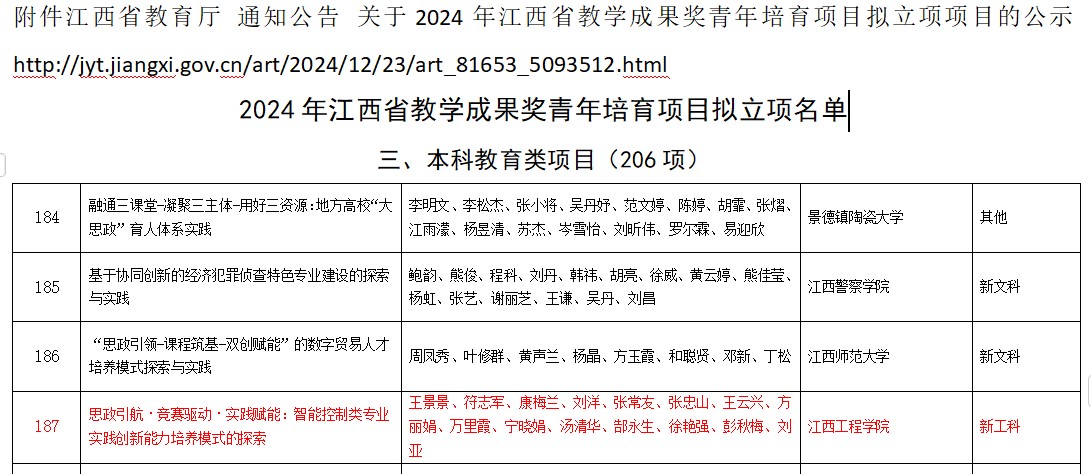 2024年12月24日,江西省教育厅对2024年江西省教学成果奖青年培育项目拟立项项目进行了公示,江西工程学院电子信息工程学院王景景团队申报的《思政引航·竞赛驱动·实践赋能:智能控制类专业实践创新能力培养模式的探索》项目成功入选。