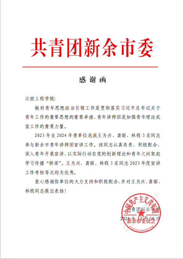 近日,我校收到来自共青团新余市委的一封感谢函,里面表扬我校人工智能与数据科学学院团总支书记林稳老师和马克思主义学院王为兴、龚丽老师,并颁发共青团新余市委“优秀讲师”荣誉证书。