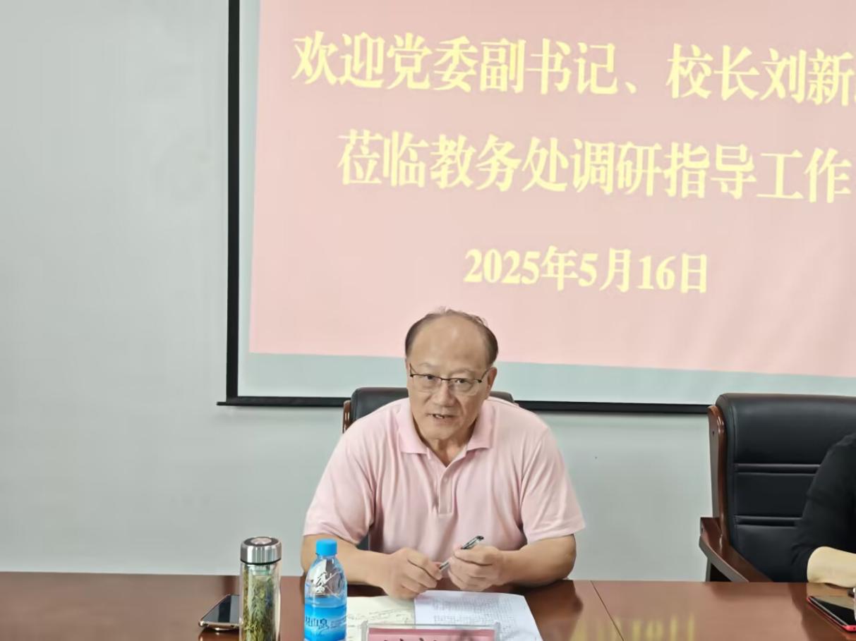 刘新跃强调,本科教学工作是学校核心工作之一,要将本科教学放在优先发展的战略地位,不断强化和提升本科教学的质量和水平。他就持续做好本科教学工作提出三点要求:一是提高站位,增强责任感和使命感,把本科教学工作作为学校发展的重中之重;二是加强学习,深化教育教学改革,创新人才培养模式,加强课程建设,提升教学质量;三是改革创新,要让学生忙起来、老师强起来、管理严起来、效果实起来、服务热起来、改革优起来、评估好起来。刘新跃还就教务处在当前教学工作和迎接本科教学工作合格评估过程中面临的一些具体问题提出了具体的解决思路和建议,鼓励教务处全体干部要勇于担当、积极作为,秉持高度的责任感和使命感,认真履行职责,持续提升教学管理水平与服务质量,为学校本科教学工作合格评估及教育事业发展贡献智慧和力量。整个调研过程中,刘新跃认真听取大家的意见和建议,不时与大家进行深入交流,氛围热烈而融洽。