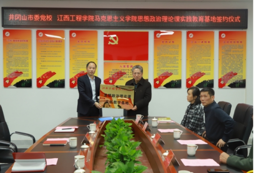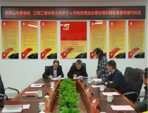 19日下午,江西工程学院马克思主义学院与中共井冈山市委党校共建思想政治理论课实践教学基地协议签署仪式在井冈山市委党校会议厅举行。中共井冈山市委党校相关负责人、副校长傅波,对外培训合作室主任周俊杰,江西工程学院马克思主义学院直属党支部书记胡延庆、院长彭豪、彭卫东教授出席签约和揭牌仪式。以实际行动开拓“大思政课”建设新格局,共同推动思政育人工作高质量发展。