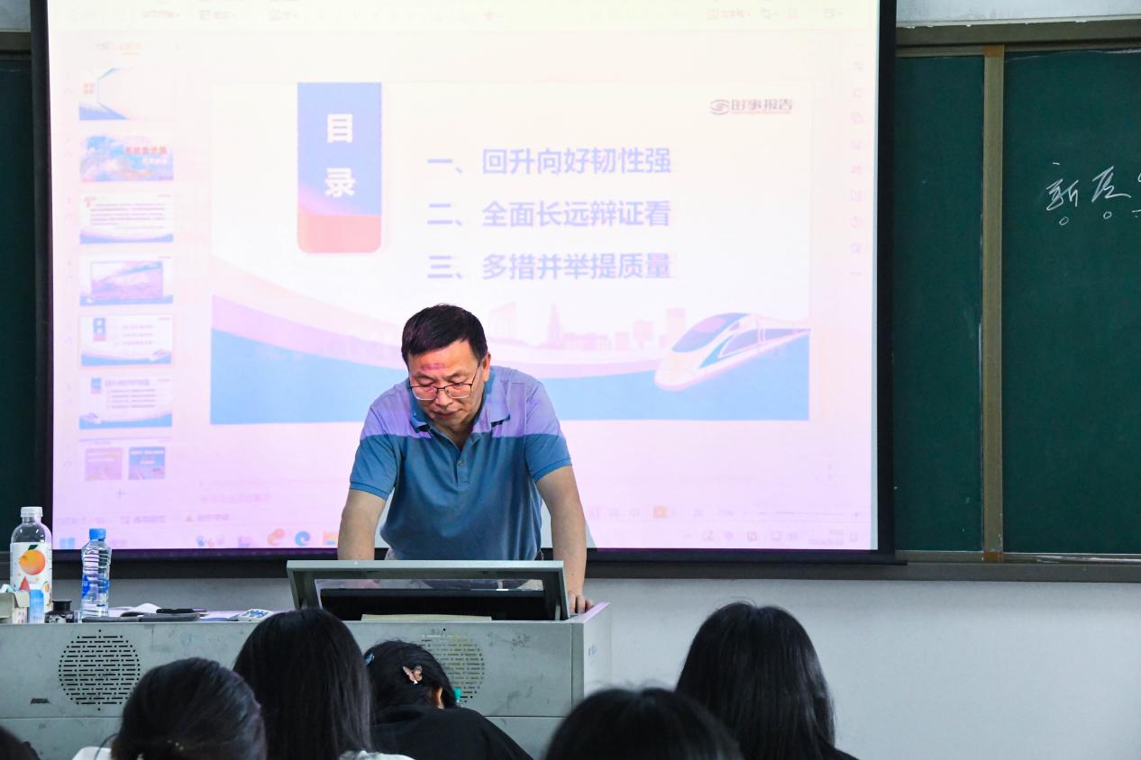 授课过程中,刘苏铭副教授以“中国经济高质量发展扎实推进”为主题,全面剖析了中国经济的发展态势、面临的复杂环境和挑战、以及具备的优势条件。刘苏铭指出,近年来,我国经济保持了平稳健康的发展态势,高质量发展取得了显著成效。他强调,面对当前复杂多变的经济形势,我们要充分认识到中国经济具有坚实的基础和长期向好的趋势,全面辩证地看待经济发展中的困难和挑战。
