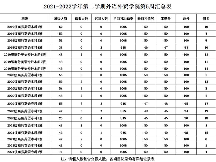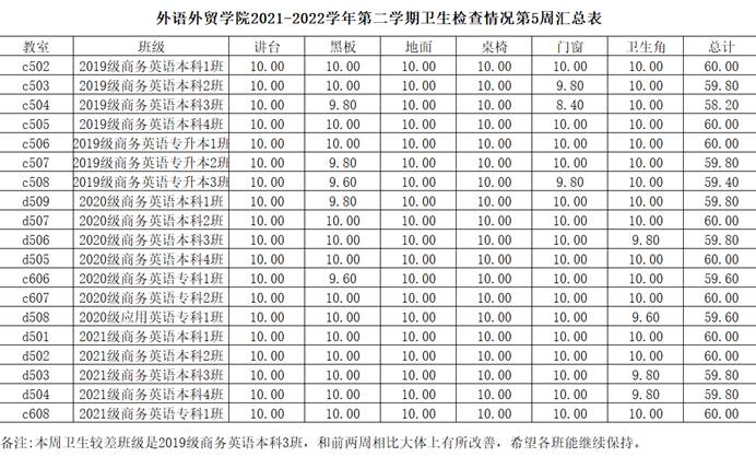 以上就是我们第五周的课堂纪检和卫生考勤情况。本周小结班级出勤率较差的班级有:2020级商务英语专科2班,2020级应用英语专科1班。个人出勤率较差:2020级商务英语专科2班:胡鑫海,董奕,何卉芬。本周优秀班级:2021级商务英语本科4班,2021级商务英语本科1班,2020级商务英语本科4班。本周卫生较差班级是2019级商务英语本科3班,和前两周相比大体上有所改善,希望各班能继续保持。