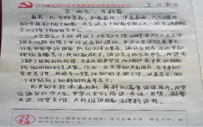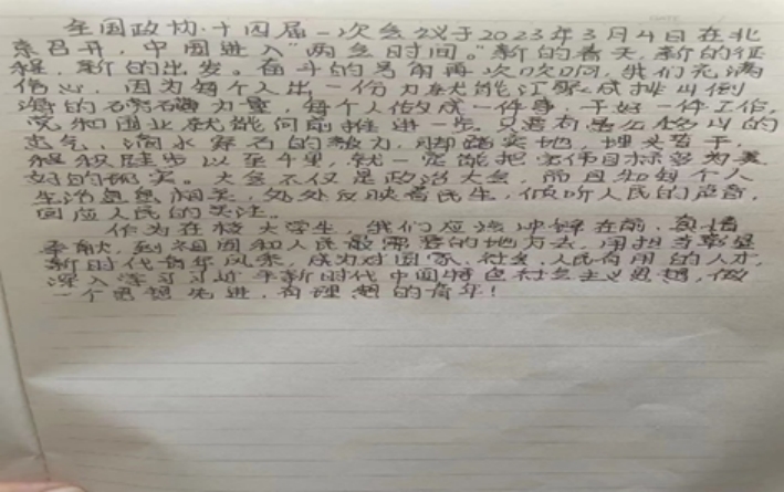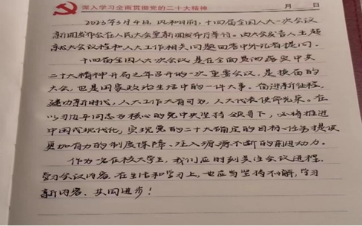同学们纷纷表示,聆听了李克强总理的报告,深刻感受到十年来祖国的日益强盛,感受到无比的骄傲与自豪。青春逢盛世,奋斗正当时。作为学生党员,要以实际行动团结带领同学们以奋发有为的精神,以锐意进取、顽强拼搏的姿态认真投入学习和生活中,为实现中华民族伟大复兴贡献青春力量,让青春在全面建设社会主义现代化国家的火热实践中绽放绚丽之花!
