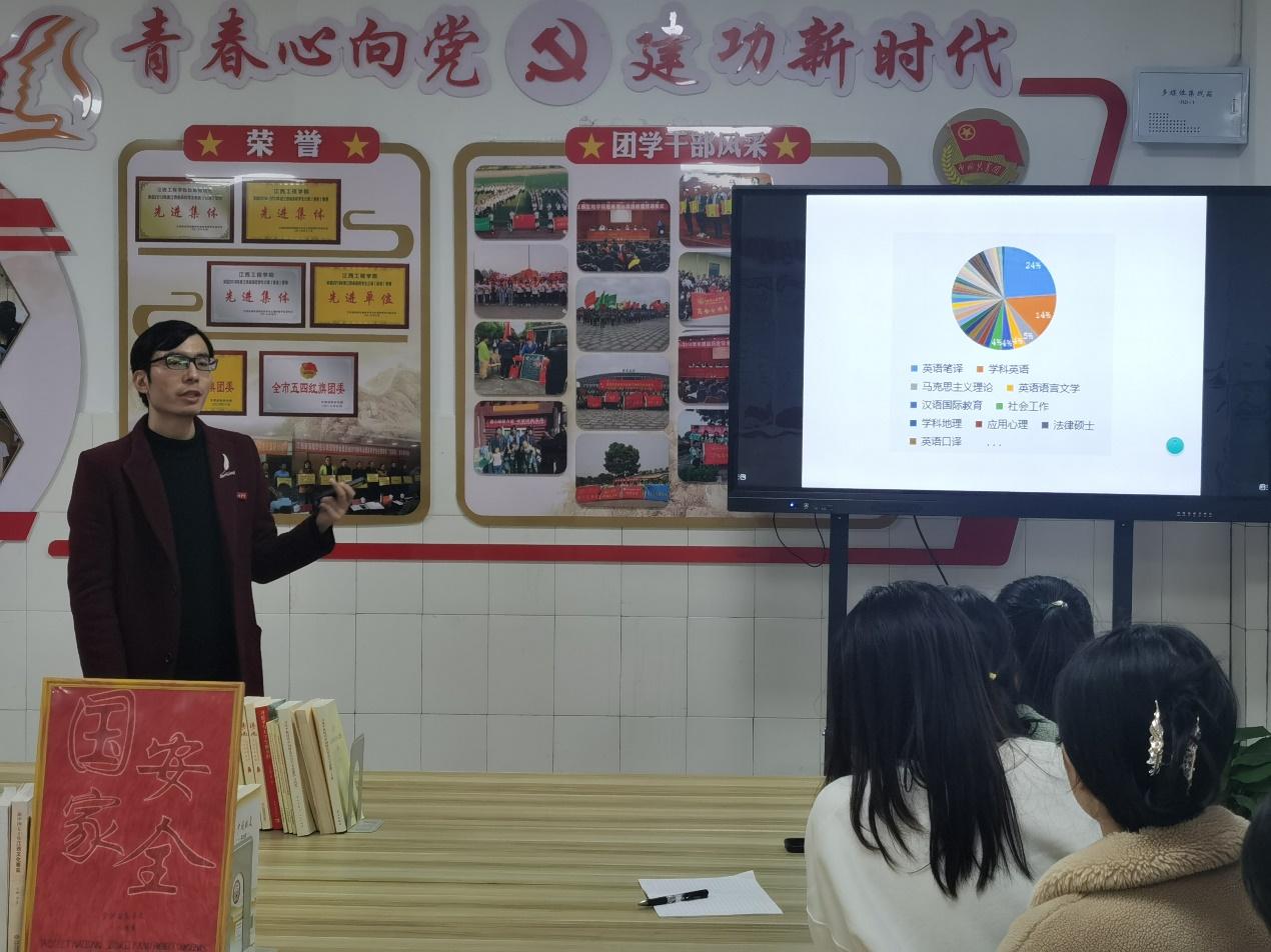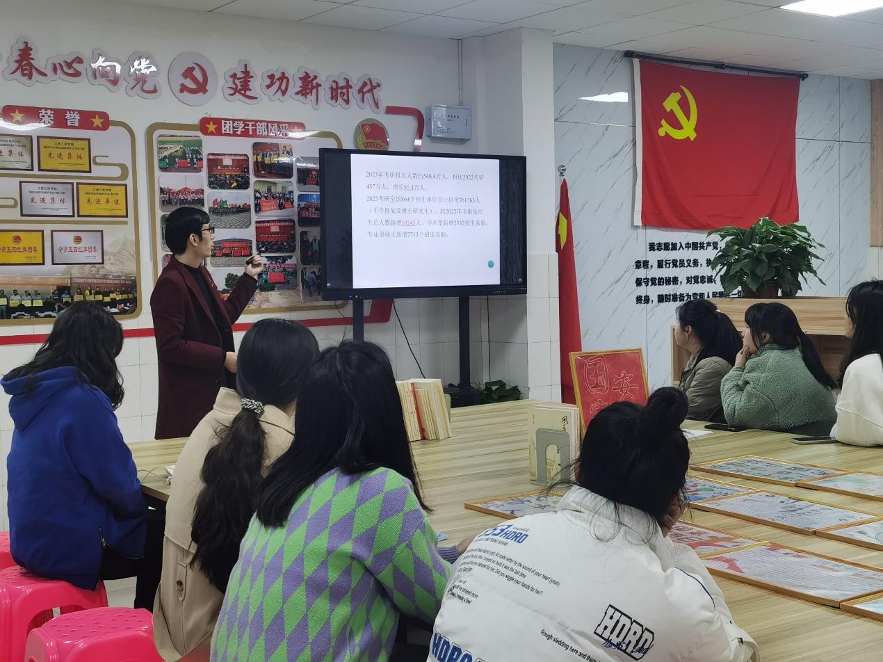 为扎实做好我院考研工作,帮助学生选择考研专业、目标院校和制定考研规划, 3月28日晚,我院于党团活动室开展"'研'途学习二十大,勤朴敏信伴冬夏"——考研指导公开课,由外语外贸学院易威伟老师担任指导教师,会议主要分为择校,择专业,报录比解读,复习建议和现场答疑几个部分。