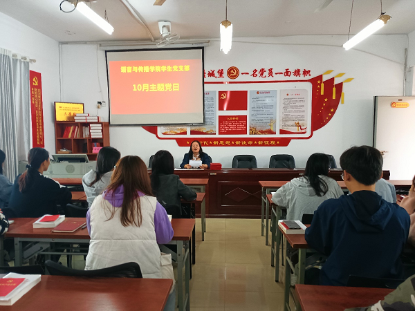 10月13日,语言与传播学院在教学楼C601会议室组织开展十月份主题党日活动。本次活动由党支部书记傅煜平同志主持,支部全体党员参加。
