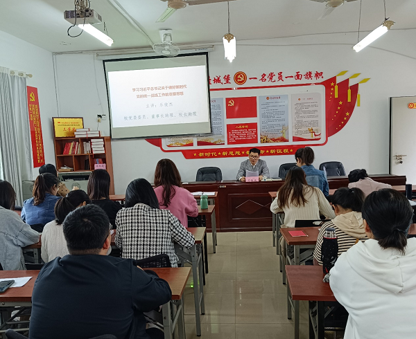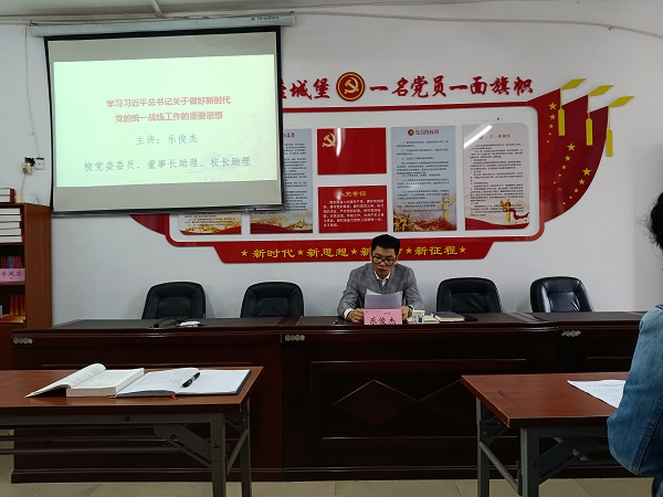 为了深入推进我校学习贯彻习近平新时代党的统一战线工作的重要思想,根据学校安排,10月11日下午,校党委委员、董事长助理、校长助理乐俊杰老师在教学楼C601会议室为语言与传播学院全体党员教师讲授专题党课。