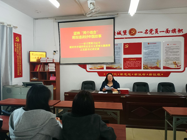 为深入推进学习贯彻习近平新时代中国特色社会主义思想主题教育,按照学校关于主题教育的部署要求。10月13日,语言与传播学院学生党支部书记傅煜平书记结合学院实际和党支部工作,在学院C601会议室,以《坚持“两个结合”,用双语讲好中国故事》为题,讲授了学习贯彻习近平新时代中国特色社会主义思想主题教育专题党课。