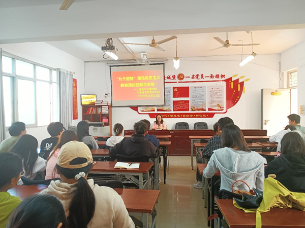 10月24日,轮训第二场,学生党支部在C601会议室开展党员培训,培训由党支部书记傅煜平主持,支部全体党员参加。傅煜平同志围绕习近平总书记关于教育方面的重要论述,为党员们讲授了题为《“九个坚持”是马克思主义教育理论创新与发展》的党课。她从三个方面进行了阐述:一是“九个坚持”全面体现了马克思主义理论和社会主义教育实践的历史逻辑;二是“九个坚持”是当代中国马克思主义教育理论的精髓;三是“九个坚持”是新时代我国教育改革创新的行动指南。她指出,“九个坚持”聚焦新时代我国教育改革创新的重大命题,系统回答了“为谁培养人、培养什么人、怎样培养人”的根本问题,全面反映了习近平总书记关于教育的重要论述的基本理论、基本观点、基本方法,创新与发展了马克思主义教育理论,是加快推进教育现代化、建设教育强国、办好人民满意的教育的根本遵循。