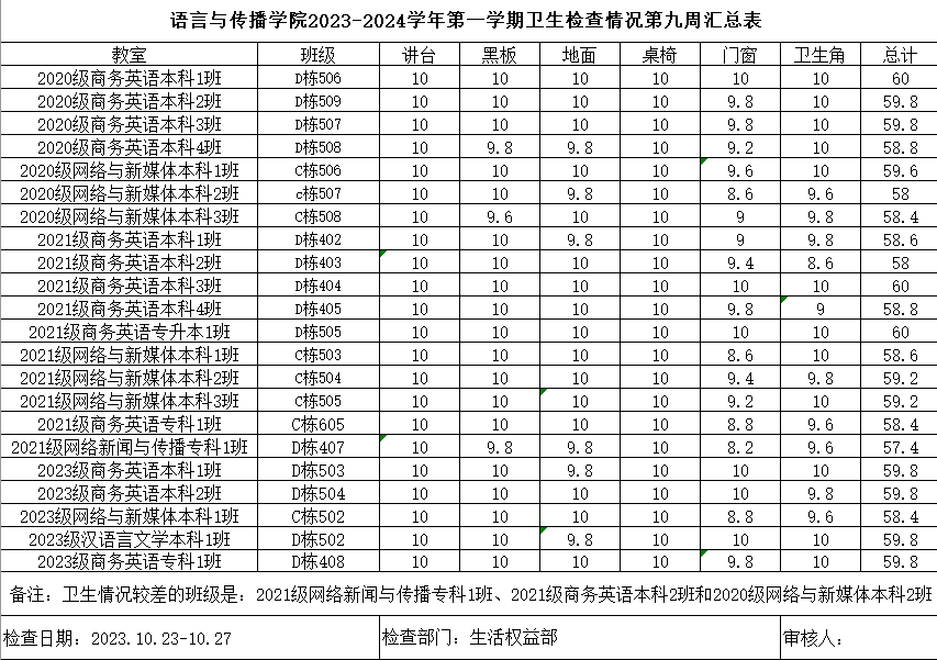 以上就是我院第九周的卫生及考勤情况。大部分班级表现很好,但还有部分班级需要加强卫生管理,卫生角和门窗的卫生需要引起重视,希望下次能有所改善。