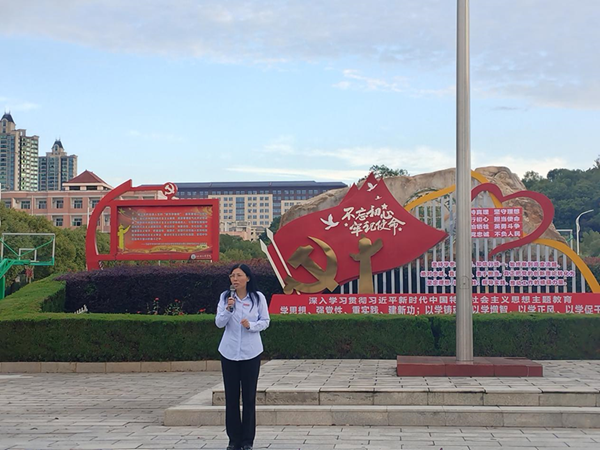 语言与传播学院院长车凤英在国旗下讲话。车院长指出,作为新时代新青年,我们要坚决听党话、跟党走;要强化爱国意识,将个人成长成才与国家前途发展结合起来,深入学习贯彻奋斗精神;要涵养优秀品格,在学习生活中崇礼尚德,培育优良作风,在青春的赛道上跑出属于自己的精彩,争做优秀江工人。