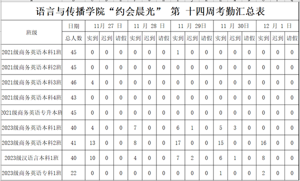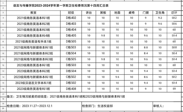 以上就是我院第十四周的卫生及考勤情况。大部分班级表现很好,但还有部分班级需要加强卫生管理,卫生角和门窗的卫生需要引起重视,希望下次能有所改善。