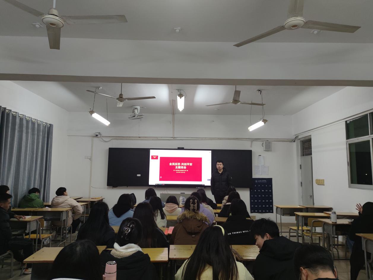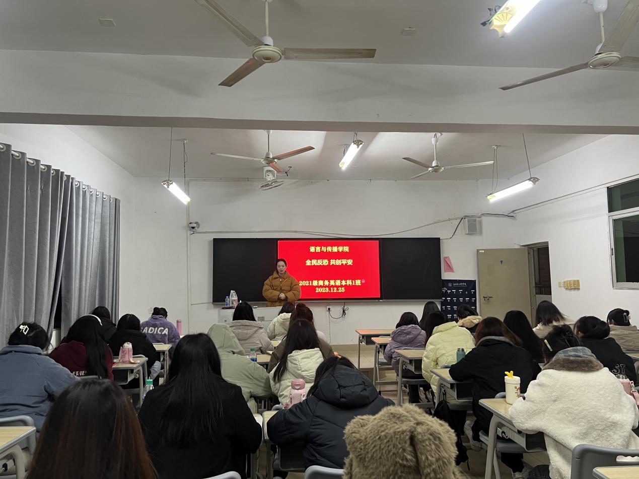为贯彻落实习近平总书记有关反恐工作的重要批示,加强反恐教育,进一步强化安全监管力度,语言与传播学院于12月24日,由各班级辅导员进班组织开展“全民反恐,共创平安”主题班会。