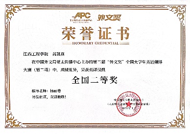 由中国外文局亚太传播中心(人民中国杂志社、中国报道杂志社)主办的第二届“外文奖”全国大学生英语翻译大赛(第二场)于12月7日顺利结束。随着成绩的公布,我院学子在激烈的角逐中脱颖而出,取得了优异的成绩。