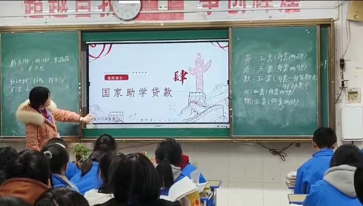 寒假伊始,我选择回到自己原先就读的高中进行宣传。我提前和自己原先的班主任沟通,在取得了她的同意后,我来到指定的班级进行宣讲。学弟学妹都很高兴的欢迎了我,并且很认真的听我讲解。而我的PPT主要介绍了国家的四个资助政策——国家奖学金,国家励志奖学金,国家助学金和国家助学贷款。