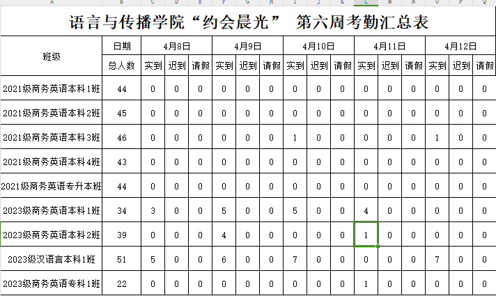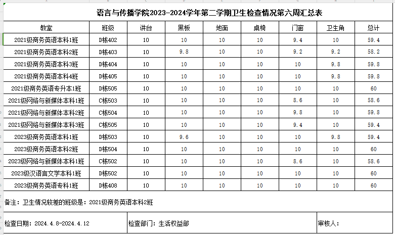以上就是我院第六周的卫生及考勤情况。大部分班级表现很好,但还有部分班级需要加强卫生管理,卫生角和门窗的卫生需要引起重视,希望下次能有所改善。
