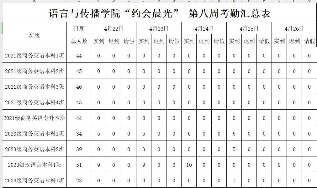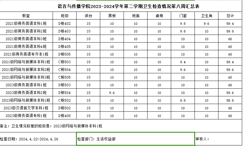 以上就是我院第八周的卫生及考勤情况。大部分班级表现很好,但还有部分班级需要加强卫生管理,卫生角和门窗的卫生需要引起重视,希望下次能有所改善。