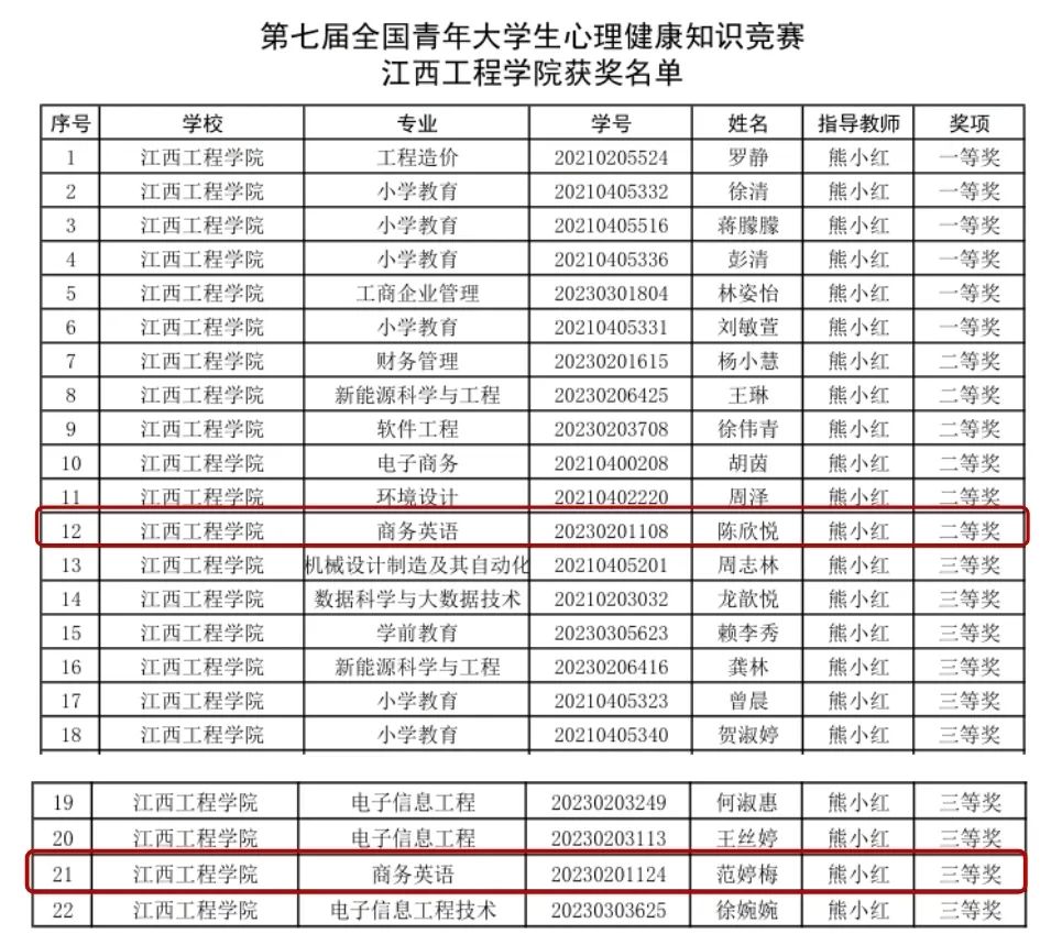 为进一步宣传普及青年大学生心理健康知识,提高青年大学生心理健康意识、心理防护意识和自我心理调适能力,促进青年大学生心理健康发展,营造良好的校园心理健康文化氛围,学院积极动员,精心组织学生参加第七届全国青年大学生心理健康知识竞赛,我院学子陈欣悦、范婷梅分别取得二等奖和三等奖的好成绩。