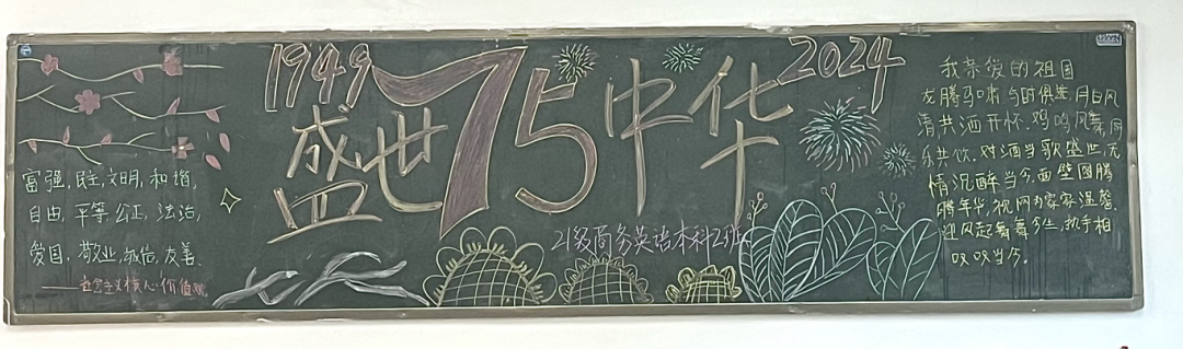 盛世华诞,举国同庆。为庆祝新中国75周年华诞,推进校园文化建设,充分发挥黑板报的宣传教育作用。在国庆节来临之际,语言与传播学院举办了“迎国庆”主题黑板报展示活动。