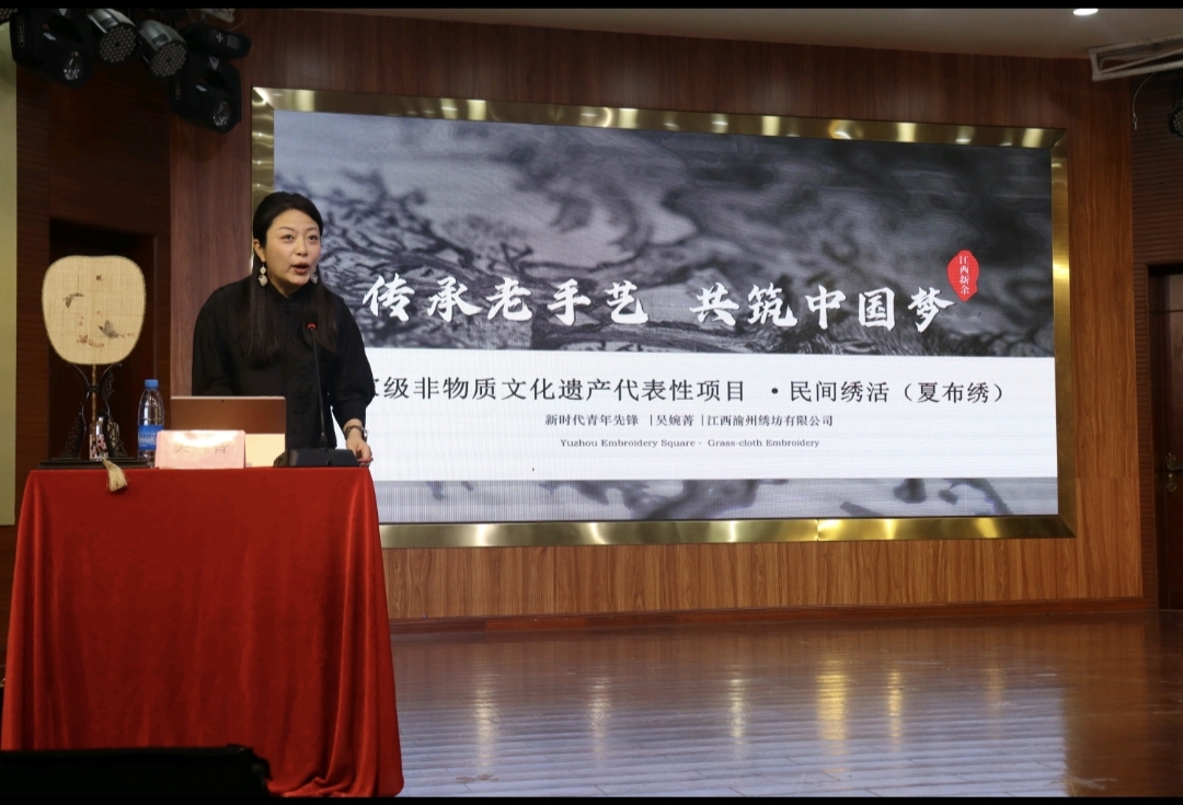 在中华民族悠久的历史长河中,非物质文化遗产如同璀璨的明珠,闪耀着独特的文化光芒。其中,民间绣活夏布绣以其深厚的文化底蕴和精湛的技艺,成为了中国非物质文化遗产的重要代表。江西省渝州绣坊有限公司吴婉菁女士走进江西工程学院于2025年5月14日为语言与传播学院学子上了生动的一堂课。
