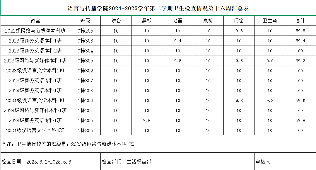 教室卫生检查旨在确保学校教学环境整洁、卫生,为学生提供一个良好的学习氛围。通过定期检查,可以及时发现并解决教室卫生存在的问题,促进学生养成良好的卫生习惯,提高整体教学质量。生活权益部对每个班级按照学校规定的每周检查频率执行。依据学校制定的教室卫生标准,对教室的地面、桌面、黑板、窗户、门、墙面、天花板、垃圾桶及教学设施等进行全面检查。以下是各班第十六周的卫生情况。