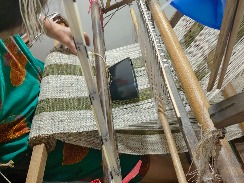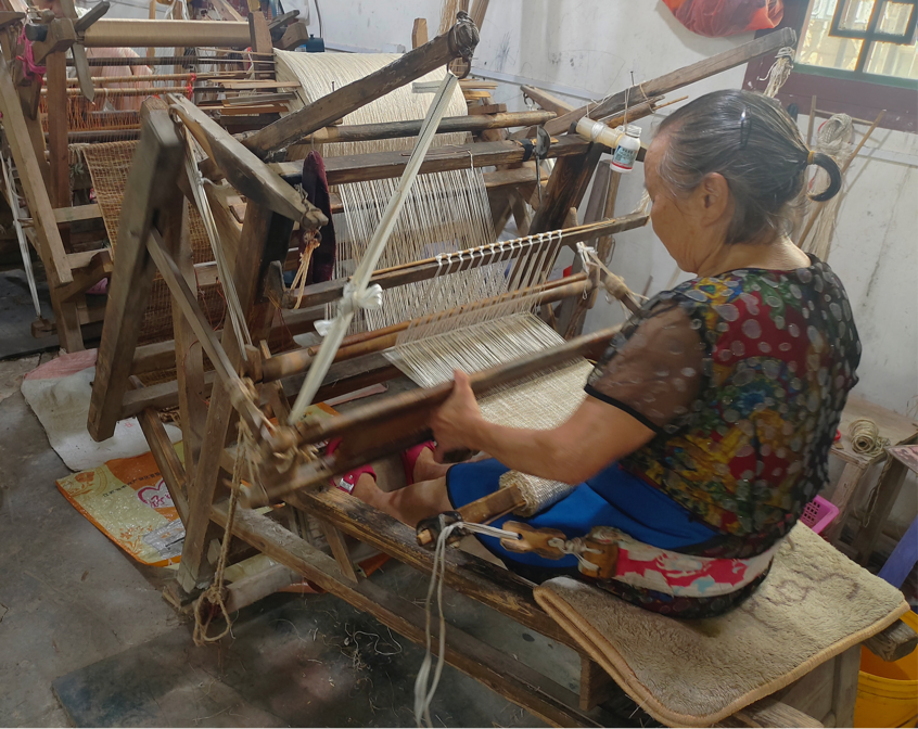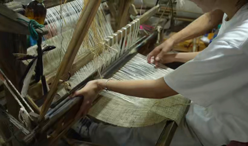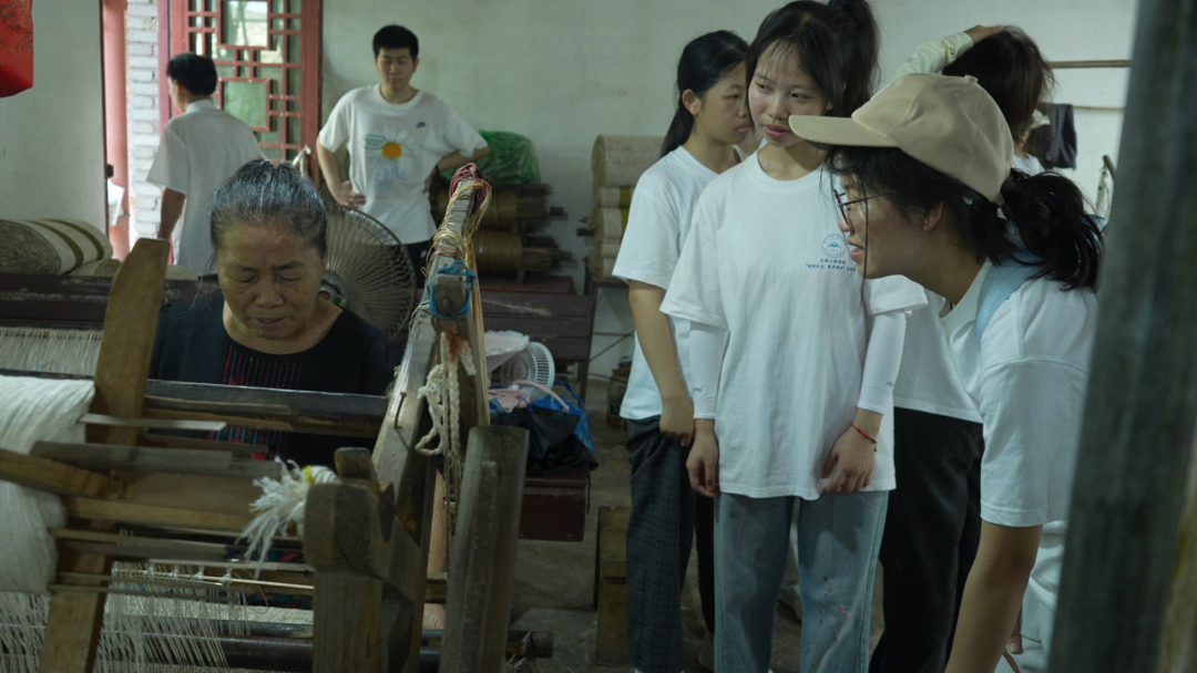 紧接着,队员们又步入古朴的夏布坊,粗粝却坚韧的夏布在阳光下泛着自然的光泽,夏布传承人昌水莲老师正端坐在织机前,专注地穿梭引线。