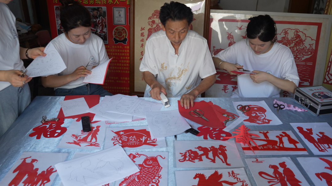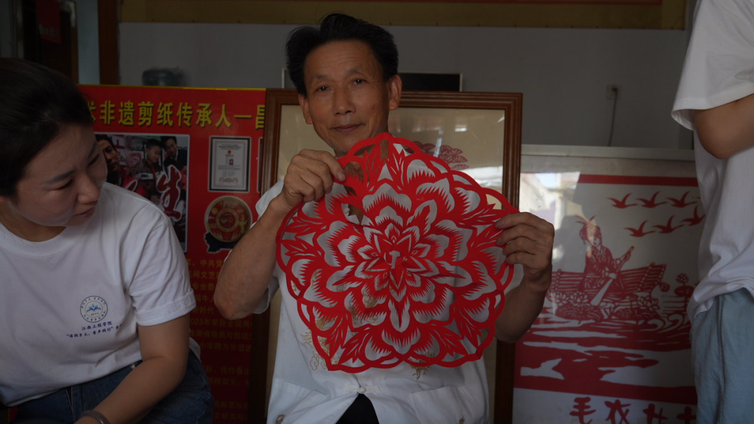 首先,实践队队员们受邀走进中国当代非物质文化遗产传承人——昌新保老师的工作室,聆听他与剪纸艺术相守半世纪的故事。只见昌老师指尖翻飞间,一张张红纸便化作栩栩如生的“乡村振兴”“党徽映初心”等主题作品,让队员们惊叹不已。一幅幅栩栩如生的剪纸作品,如红色故事的生动注脚,承载着厚重文化。