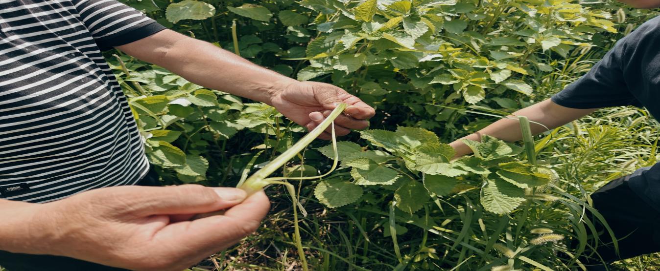 采访结束后,在农户的热情带领下,队员们走进当地的苎麻种植基地。田间地头,成片苎麻郁郁葱葱,修长的茎秆上覆盖着层层绿叶,微风拂过,露出茎秆间泛着自然光泽的韧皮纤维——这正是夏布制作的核心原料。