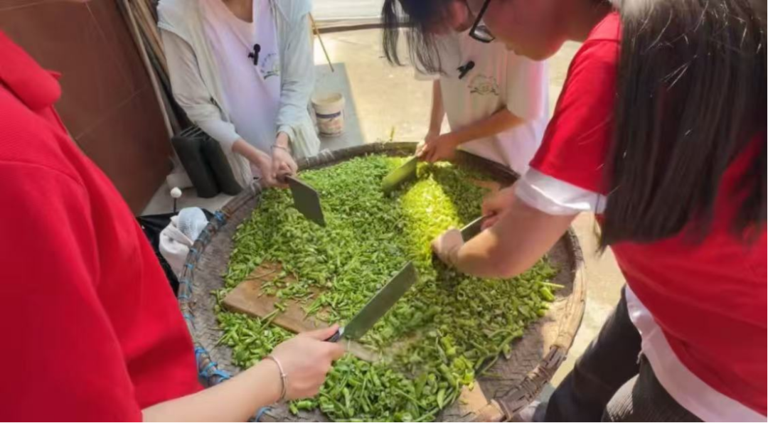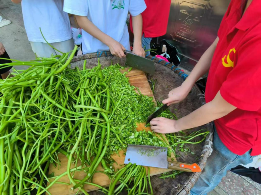 在哲村的农家小院,队员们接力开启“食材变身”之旅。刚从菜园采摘的鲜蔬,经择菜、洗菜的细致处理,此刻在竹匾上迎来“终章”。队员们并肩行动,菜刀起落间,青绿菜段簌簌落下,带着泥土气息的食材,正被队员们雕琢成餐桌上的期待。这一方竹匾,承载的不只是切碎的菜,更是三下乡里,队员们触摸乡土烟火、携手劳作的温暖注脚,让青春在切菜的脆响中,和乡村生活紧紧相融。