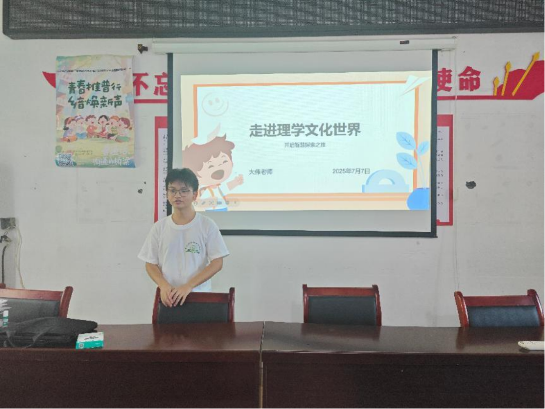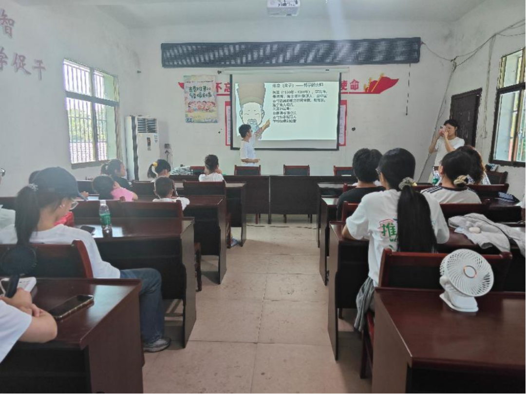 在千秋岭村,实践队队员们为当地小朋友开展了一场别开生面的理学文化讲解教育活动。队员们提前准备了内容丰富、生动有趣的课件,用通俗易懂的语言,向小朋友们介绍理学文化的内涵、历史发展以及重要意义。队员们不仅讲解理论知识,还通过讲述与理学相关的历史故事、人物事迹,让小朋友们对理学文化有更直观的感受。
