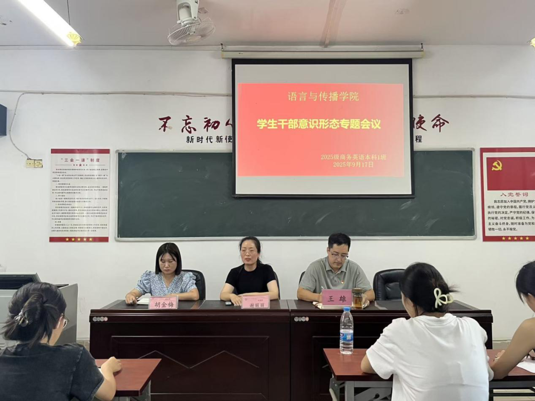 为深入学习贯彻习近平新时代中国特色社会主义思想,切实加强学生干部队伍的思想政治建设,筑牢意识形态安全防线,2025年9月17日,语言与传播学院于C栋201会议室召开学生干部意识形态专题会议。会议由学院党总支书记谢丽丽、党总支副书记王雄、团总支书记胡金梅、各班辅导员以及全体学生干部共同参与。