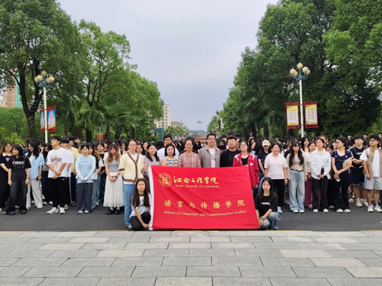 仪式最后,全体参与人员齐聚国旗之下合影留念。左右两边班级有序向中间靠拢,镜头记录下这一庄重而温暖的时刻,也定格了语言与传播学院师生们对家国的赤诚之心与对网络安全的坚定守护。