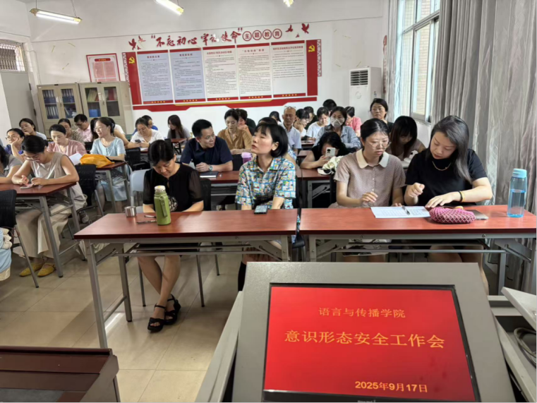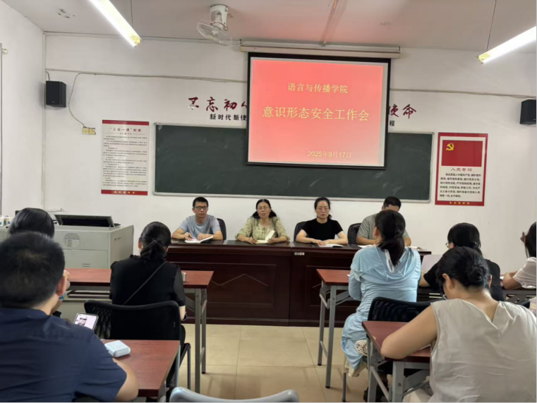 为深入贯彻落实上级关于意识形态工作的决策部署,依托学院“北斗星·红传”党建品牌的思想引领作用,切实把牢教师队伍思想方向、守好校园育人阵地,9月17日,语言与传播学院组织全体教师召开意识形态安全工作会,以党建引领压实责任,为教育教学工作筑牢思想根基。