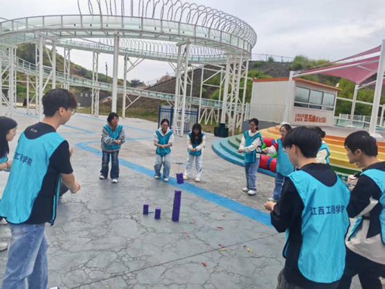 随后,活动进入到了众人合作搭积木的环节。每一队的全体成员共同合作用一根钢丝搭起积木,在搭建的过程中,大家需要密切配合,所有人用钢丝小心翼翼地将积木一块一块地往上叠加。每一块积木的放置都至关重要,稍有不慎就可能导致整个积木塔倒塌。经过一番努力,各个队伍都完成了自己的积木塔,虽然高度和形状各不相同,但每一个都凝聚着团队成员的智慧与汗水。通过这个活动,同学们深刻体会到了团队协作的重要性,明白了只有大家心往一处想,劲往一处使,才能克服困难,取得成功。